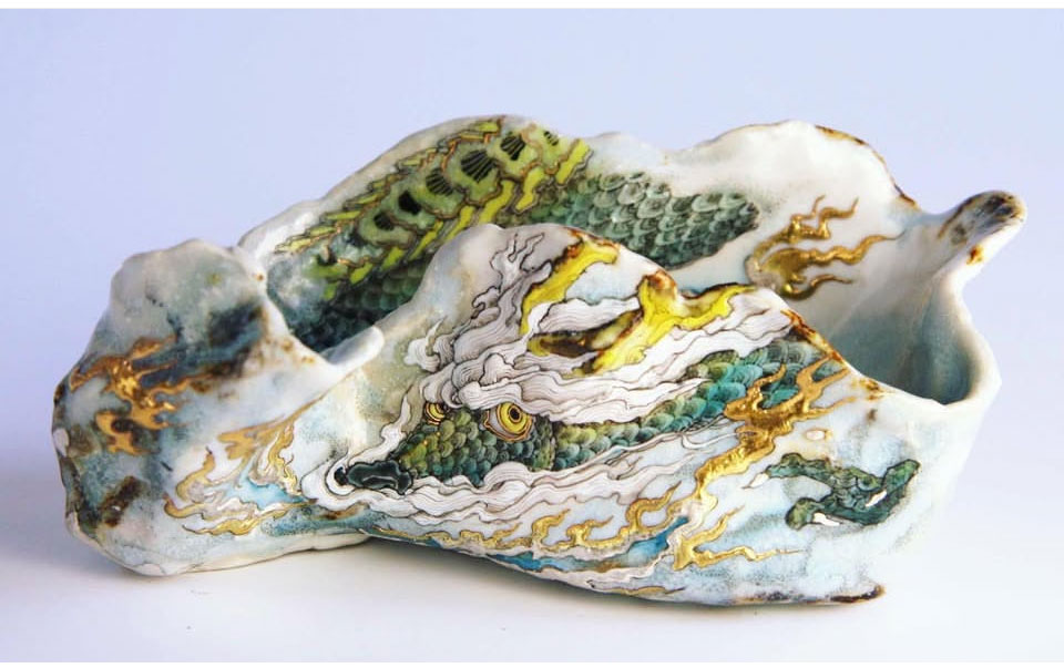 薪窯で焚いた磁器作品。気高い龍が昇る