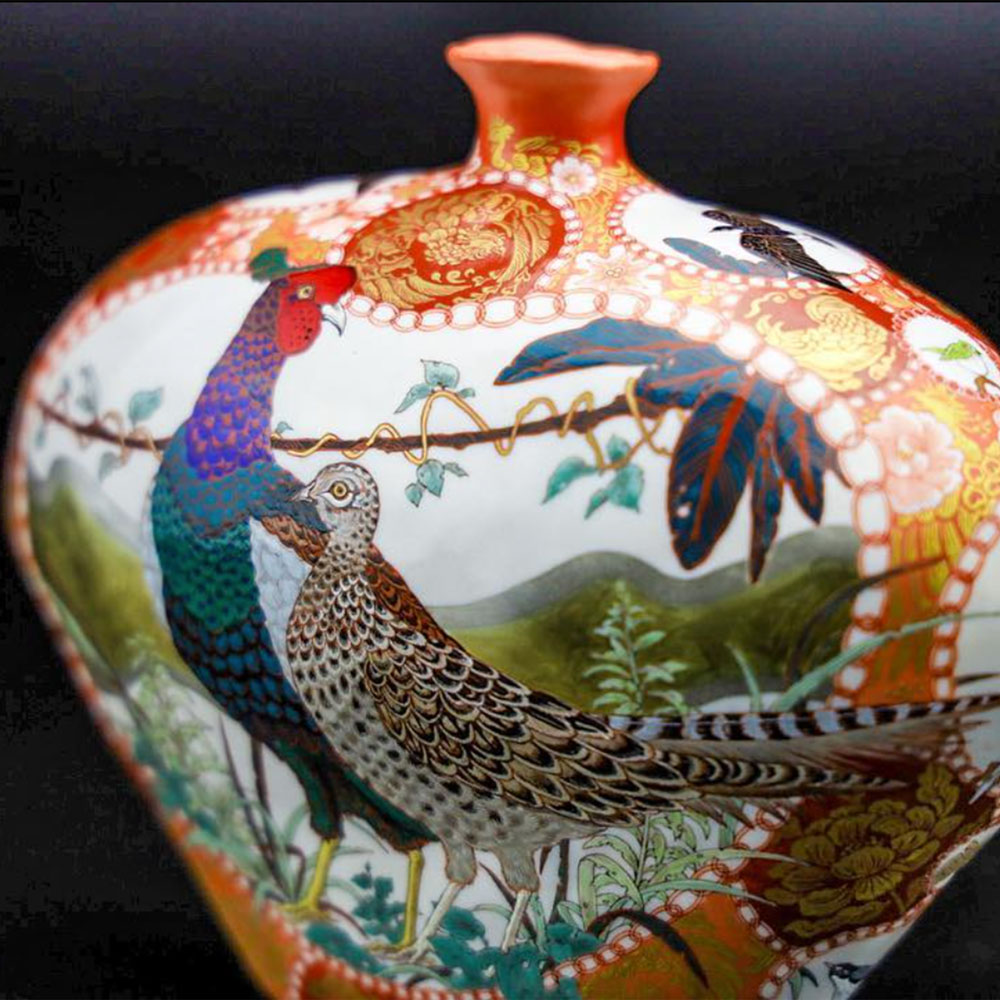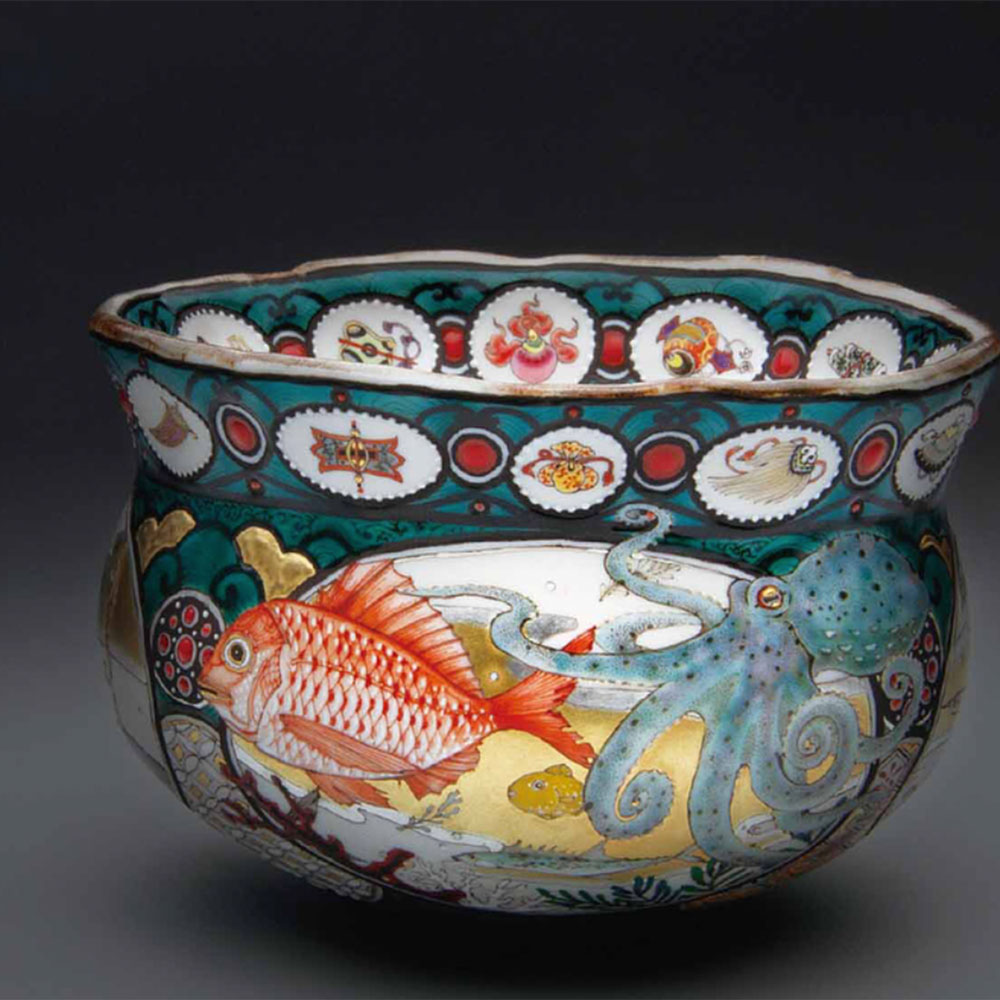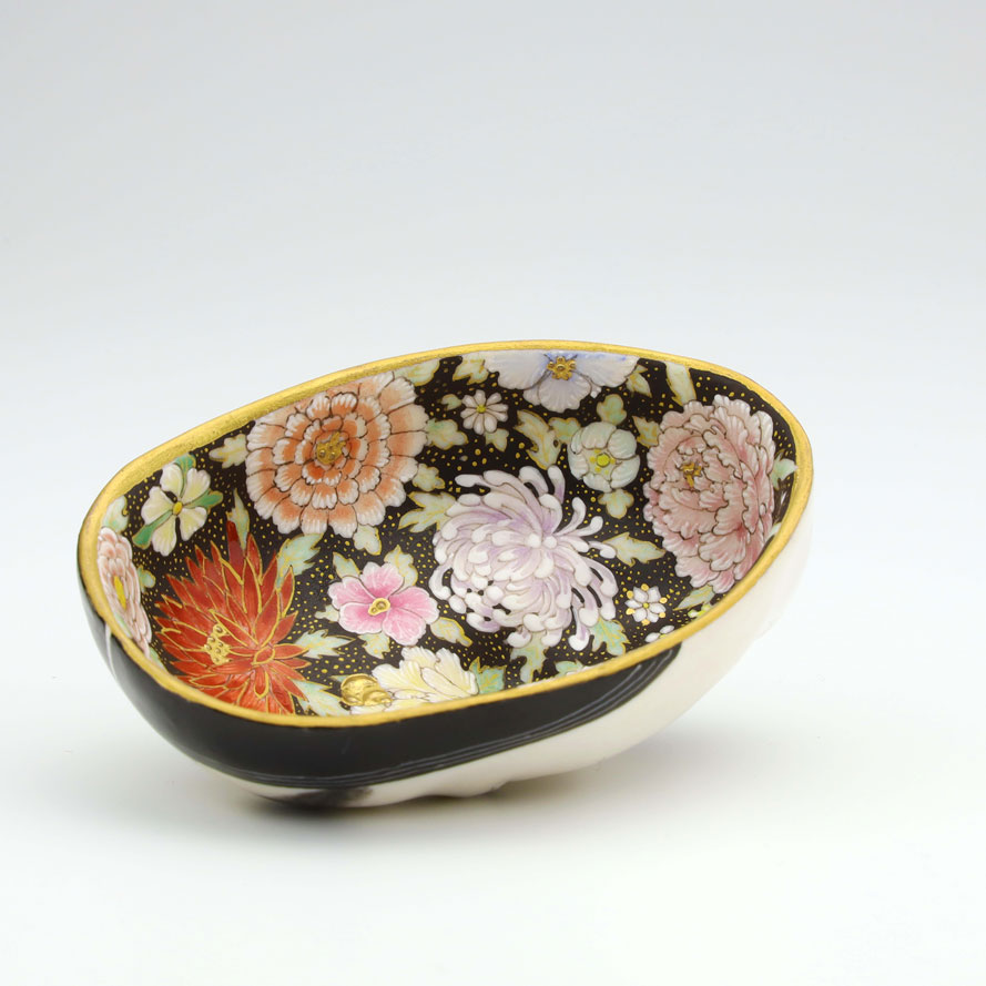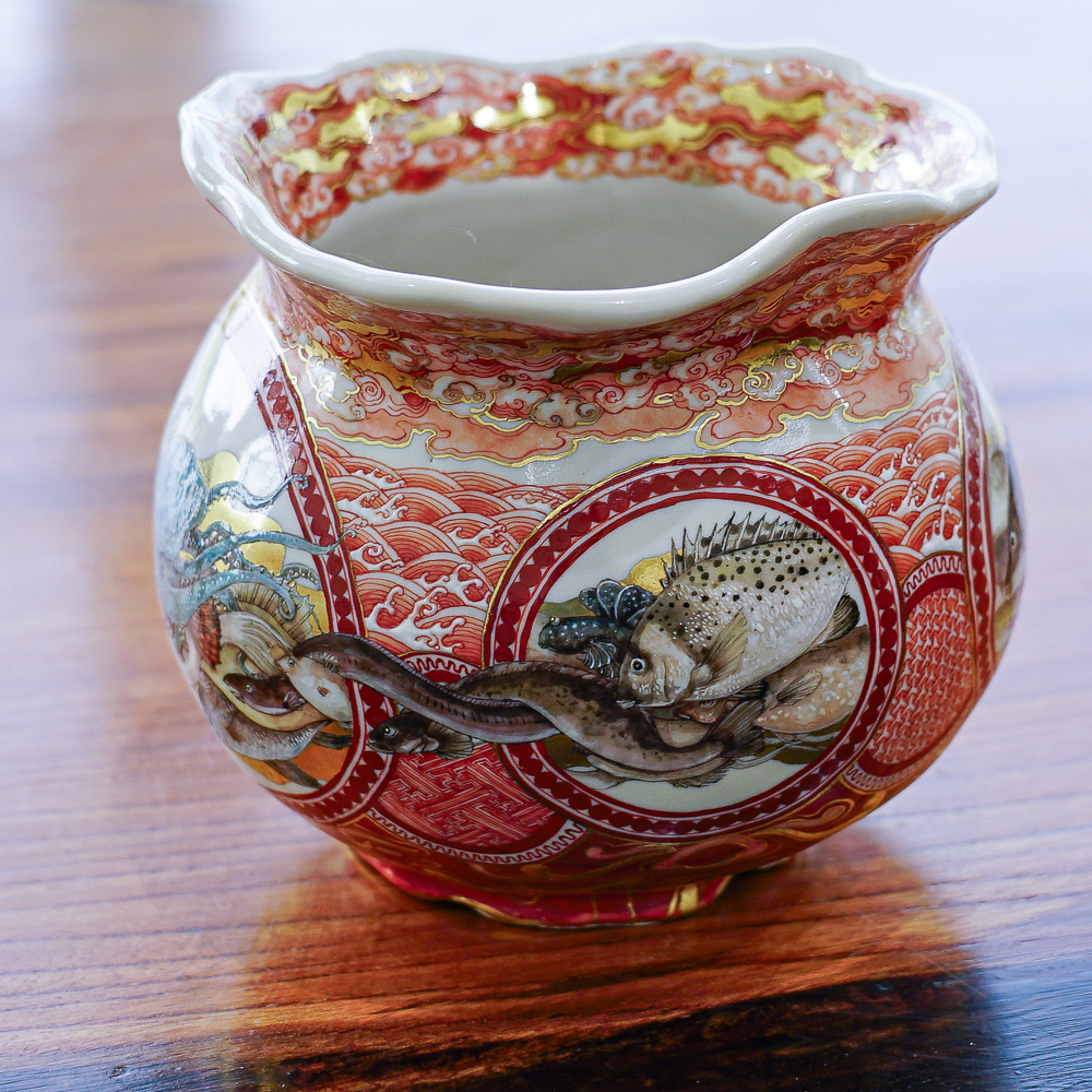 ー牟田さんの作品には、赤絵の他にも、さまざまな加飾技法や古典柄を取り入れていて、この作品の花詰も素敵です。