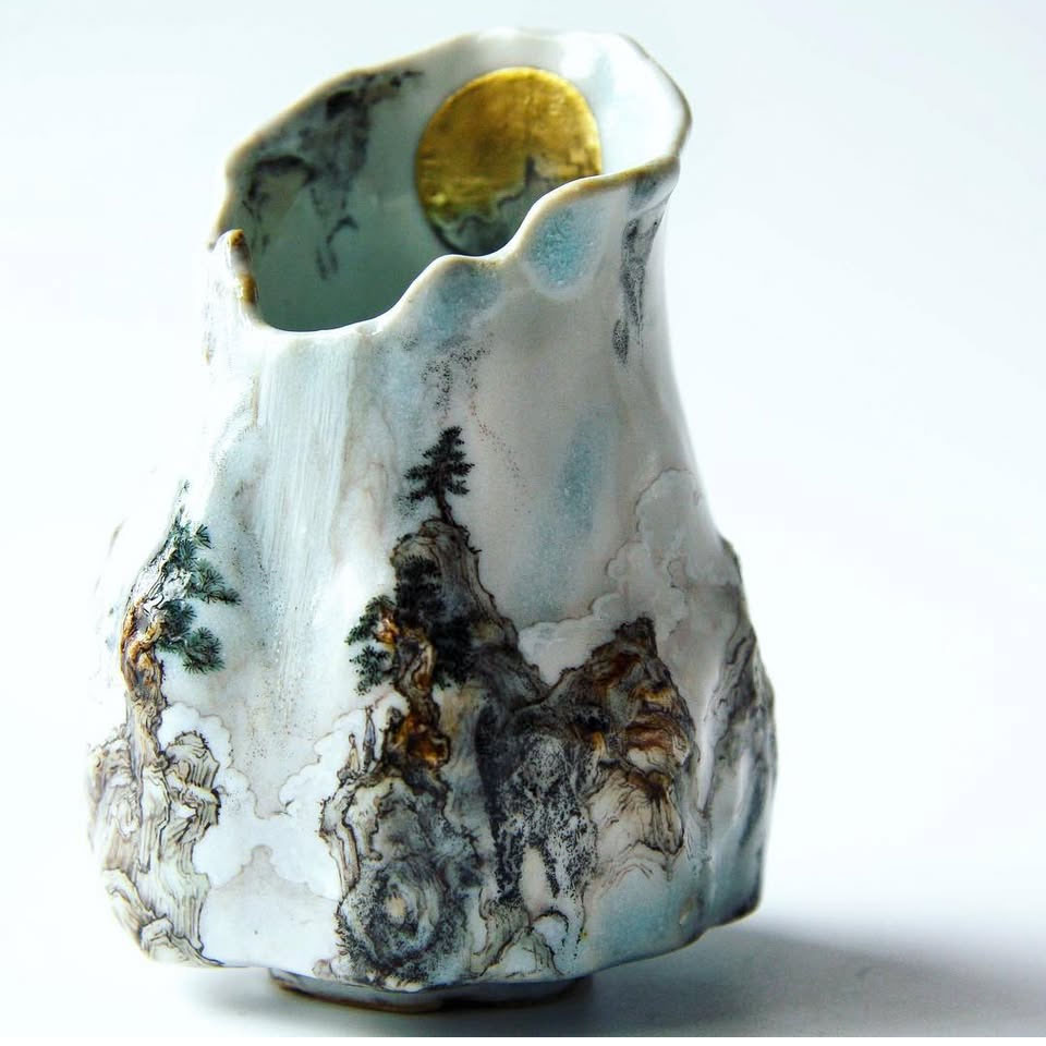 _造形と絵との一体感も牟田作品の魅力の1つ。こちらは、器の側面には滝を、見込み(器の内側)には月が描かれていて、一方向から見ると一つの絵になるという。