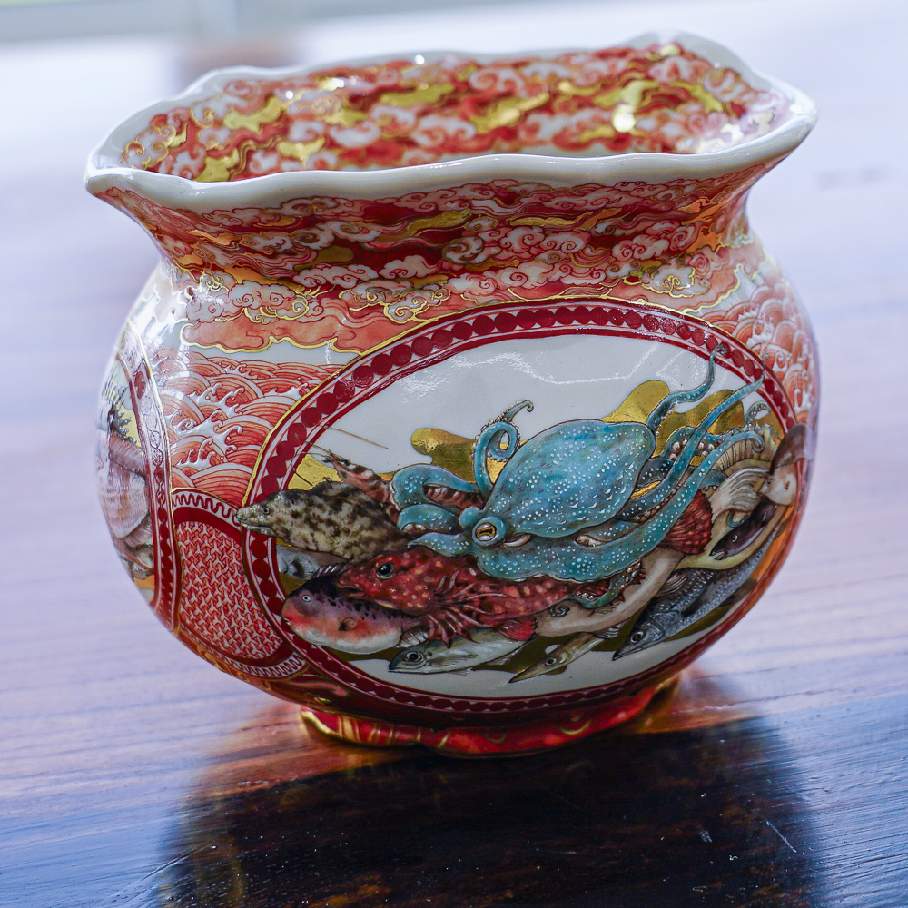 「去年、能登にある輪島の黒島地区に行ってきました。震災で大きなダメージを受けていて、黒島の美しい街並みを取り戻そうと頑張っていらっしゃる方々のお話も聞きました。北前船の寄港地として栄えた歴史ある地域で、その地域のお祭りが興味深く、お祭りの時は、家の前にお宝を飾って、神輿を迎えたのだそうです。そういうのが頭に残っていて、このうみなりの茶碗もお宝のように、赤絵金彩で華やかに描いてみました。